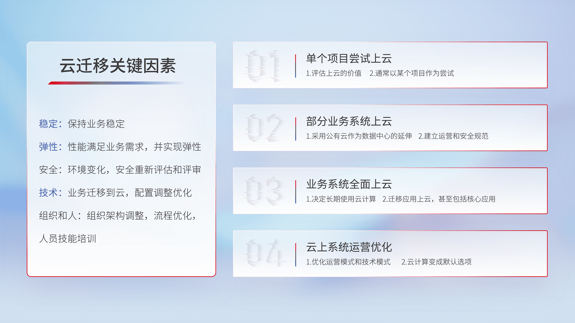 结合实际业务,,,从规划设计、、云平台选型、、、、云原生改造、、数据迁移、、集成交付,,迁移全过程为客户识别最佳上云路径,,做好风险识别管理,,,,设计网络架构、、、、身份权限、、、、安全审计合规、、、、操作审计、、、、日志审计、、、、监控告警策略、、多站点容灾设计等,,,对云上基础设施进行整体规划,,,提升IT治理水平,,,,以满足弹性、、、高可用、、、、高性能的需求。。。